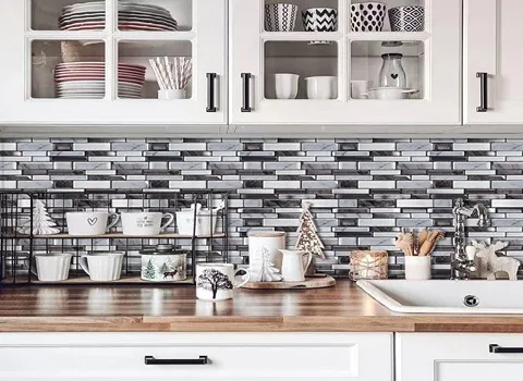 تمازج النمط والخامة: جرب تركيب بلاط لاصق يجمع بين أنماط وخامات مختلفة مثل الخشب والألومنيوم والزجاج لإضفاء تباينات جمالية وجو متناغم على مطبخك.
