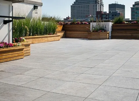 بلاط السطح الرمادي يتميز بتصميمه الأنيق الذي يضفي جوًا عصريًا على المساحات التي يتم تطبيقه فيها.