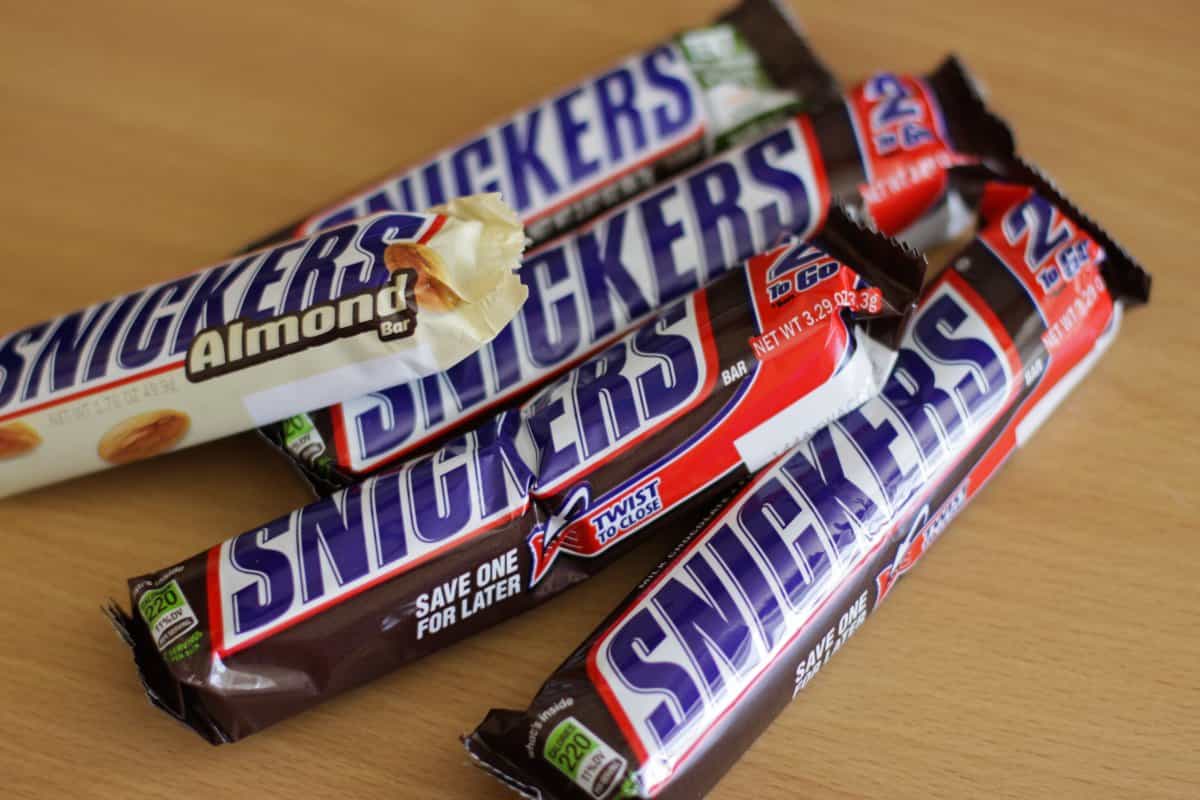 تباع شوكولاتة سنیکرز في عبوات 80 جرام بسعر 1-3 دولار.
