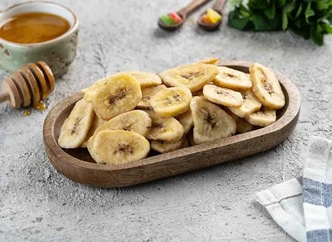 يتحول الموز الطازج الذي يحتوي على نسبة عالية من البوتاسيوم والألياف عند تجفيفه إلى وجبة خفيفة ممتازة تُعد خيارًا رائعًا للذين يبحثون عن وجبة سريعة وصحية في أوقات متأخرة من النهار.