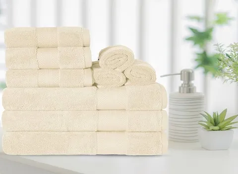4. **تنسيق الديكور**: يمكن أن يساعد طقم المناشف البيج في توحيد وتنسيق ديكور الحمام بشكل مثالي.