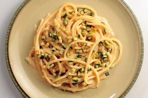 How to make this vegan pumpkin bucatini cream Start by cooking your pasta.