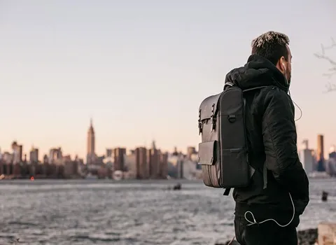 man holding a leather backpack during the golden hour BEST DESIGNER LEATHER BACKPACK: SAINT LAURENT CITY LEATHER BACKPACK If you’re down to splurge on a designer product, why not go for the most luxurious choice? Saint Laurent has been the picture of luxury for years.