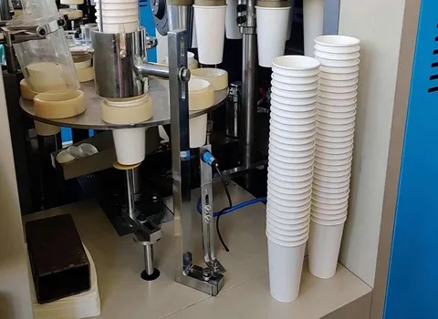 The cups are sent from the cutter to a machine that places them on the conveyor belt after being cut.