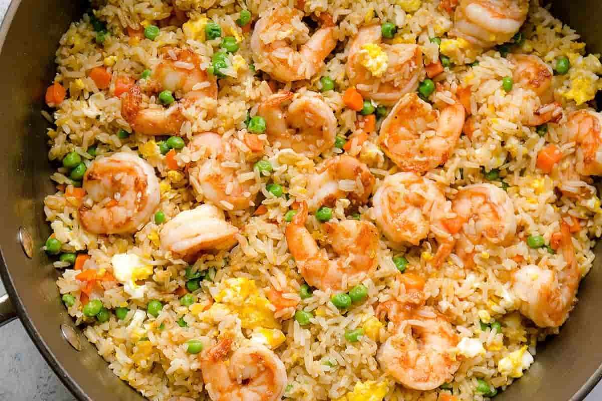 White long-grain rice, chicken breast, eggs, onions, soy sauce, corn oil, green peas, coriander seeds, and other essential spices are used in fried rice, which provides a number of health benefits.