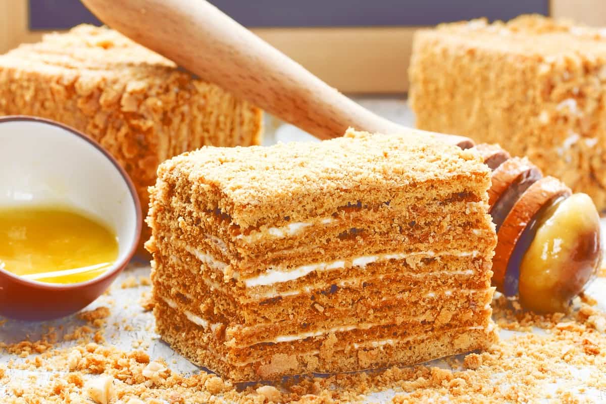 Russian honey cake, coconut honey cake, walnut honey cake, and chocolate honey cake are among the most popular types of honey cakes in the world.