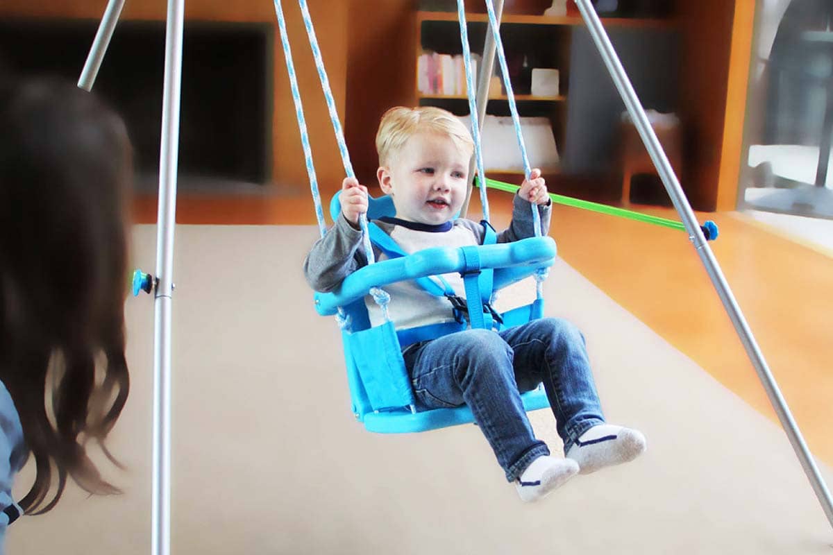 Additionally, it has particular design considerations that promote safety, such as plastic caps placed over sharp edges and soft rubber grips for swing chain handles.