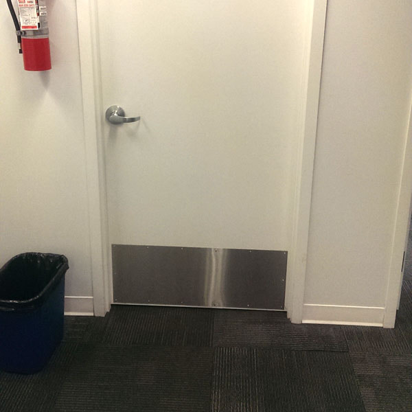 Stainless steel kick plates are appropriate for heavy traffic areas due to their strong strength.
