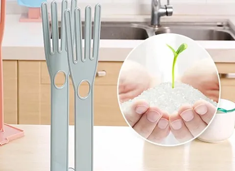 Now that you have the kitchen glove holder, you will have time to wash your gloves and napkins in the kitchen, and then you will be able to quickly place them next to the kitchen sink and on the cabinet to dry! It is sufficient to set the gloves on the stand in such a way that the apertures of the gloves face downwards; this will cause the water that is contained within the gloves to completely drain out, allowing the inner surfaces to become dry.