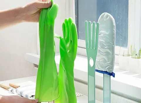 The practice of wearing rubber gloves while doing the dishes in the kitchen.