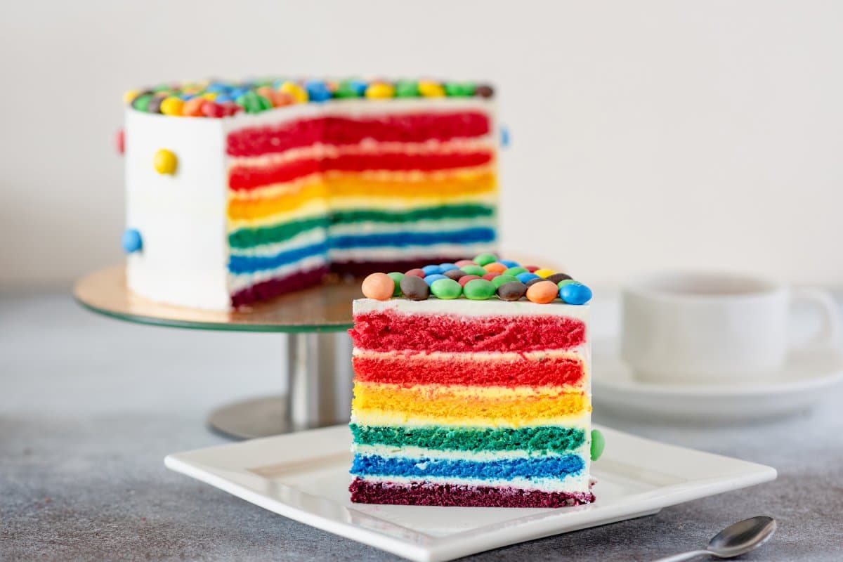 It is typically made with a white cake base and different food colorings added to each layer to produce the rainbow effect.