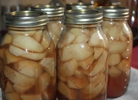 Syrup-soaked pears canned in a jar are canned foods that are largely made up of pears.
