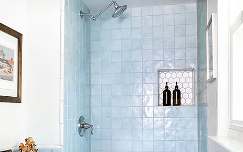 The durable and water-resistant nature of ceramic or porcelain sky blue tiles makes them an ideal option for use in wet areas, such as showers and around bathtubs.