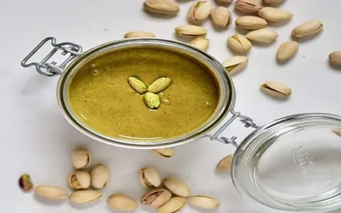 Picture this - a jar filled with a rich, creamy paste that boasts a vibrant green hue, a testament to the pure pistachio goodness contained within.