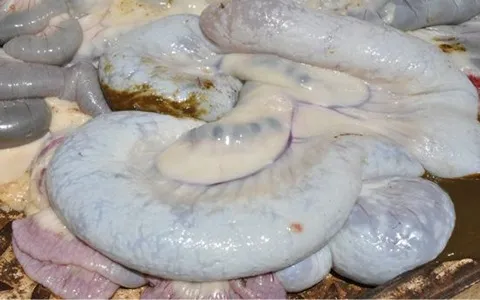 The small intestine of a sheep is a long, coiled tube that forms part of the gastrointestinal tract.