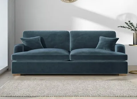 The sofa with four legs is constructed modestly overall, and the seat and back cushions are upholstered in a luxurious material.