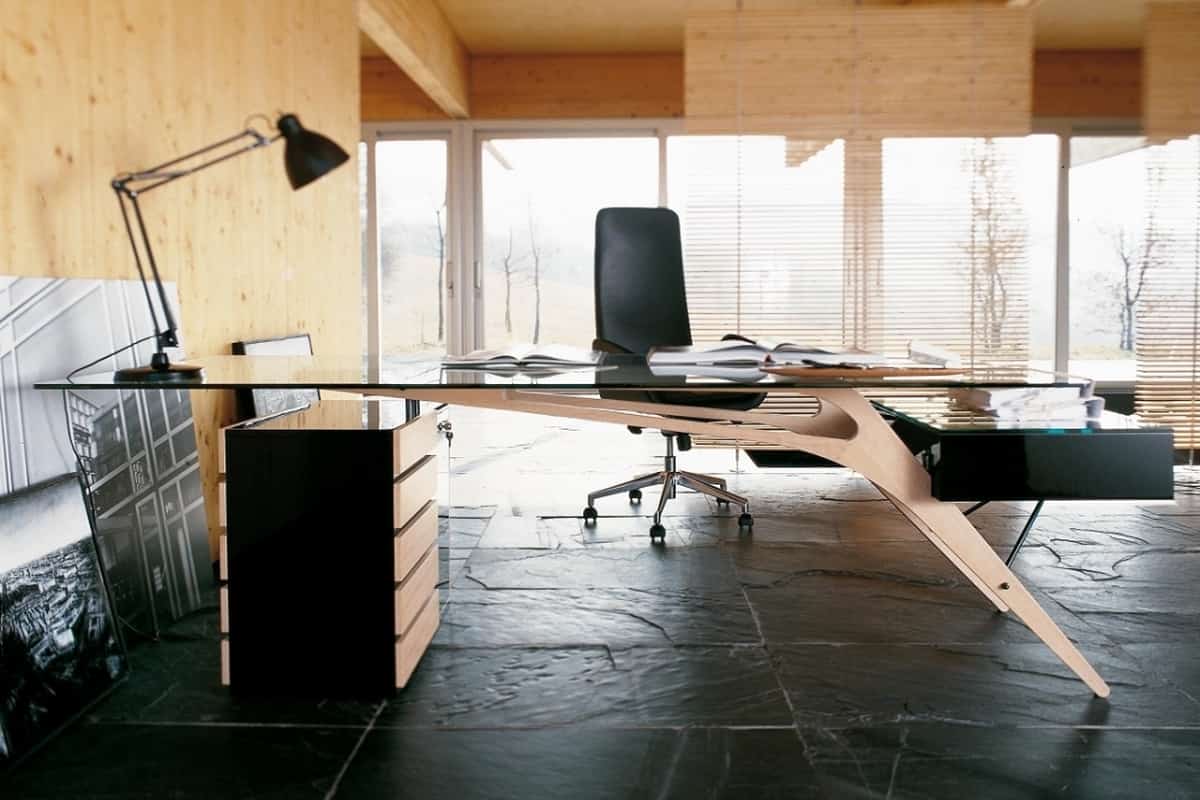Zanotta cavour desk has plate glass top with a thickness of 12 millimetres that is either clear or extremely transparent.
