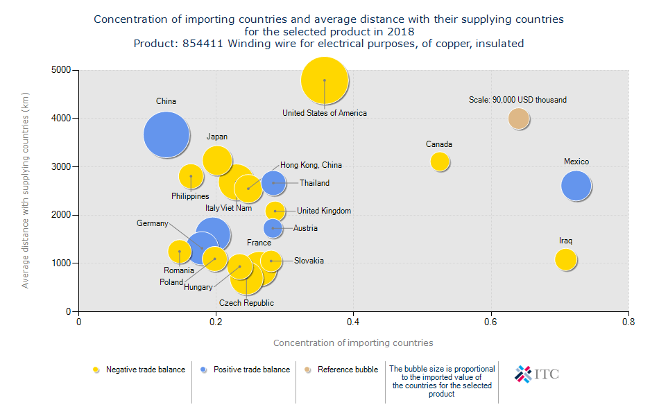 هرچه دایره ها به سمت بالاتر باشند گویای این است که فاصله ی کشور واردکننده تا محل تامین آن بیشتر است به عبارتی شعاع فاصله ای که میتوانیم در آن فعالیت کنیم بیشتر است. اگر خط عمودی این نمودار زیر ۲ الی ۳ هزار کیلومتر را نشان بدهد یعنی حمل و نقل و تامین کالای مورد بررسی بسیار مهم و موثر می باشد پس راهکارهای حمل و نقلی را باید بررسی کرد. تامین برخی از کالا محدود به کشوری خاصی است و به همین علت تامین آن از کشور های دورتر انجام میشود و به علت ارزش زیاد آن محصول حمل و نقل در آن مطرح نیست. ایران تا شعاع ۴ هزار کیلومتری قابلیت پوشش و صادرات در ۴۰ الی ۵۰ کشور را دارد. - بیشتر بخوانید: سیم و کابل سیمکان اصفهان