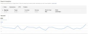 اما برای شروع چنانچه شما از قبل وبمستر دریافت کرده اید از بخش سرچ آنتیکس وارد شوید و بررسی کنید که سایت شما در چه عبارت هایی صفحه اول است. نموداری در این بخش مشاهده میکنید که تعداد کلیک های روزانه شما را نمایش می دهد برای مثال در این یک ماه خرید نخود بیشترین کلیک را گرفته است و وقتی از طریق گوگل سرچ میکنید میتوانید بالا بودن جایگاه آن (جایگاه سوم ) را مشاهده کنید.