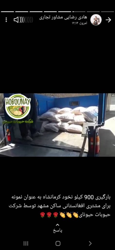 هادی رضایی در وضعیتی از بارگیری 900 کیلو نخود کرمانشاه به افغانستان، رو نمایی کرد.
