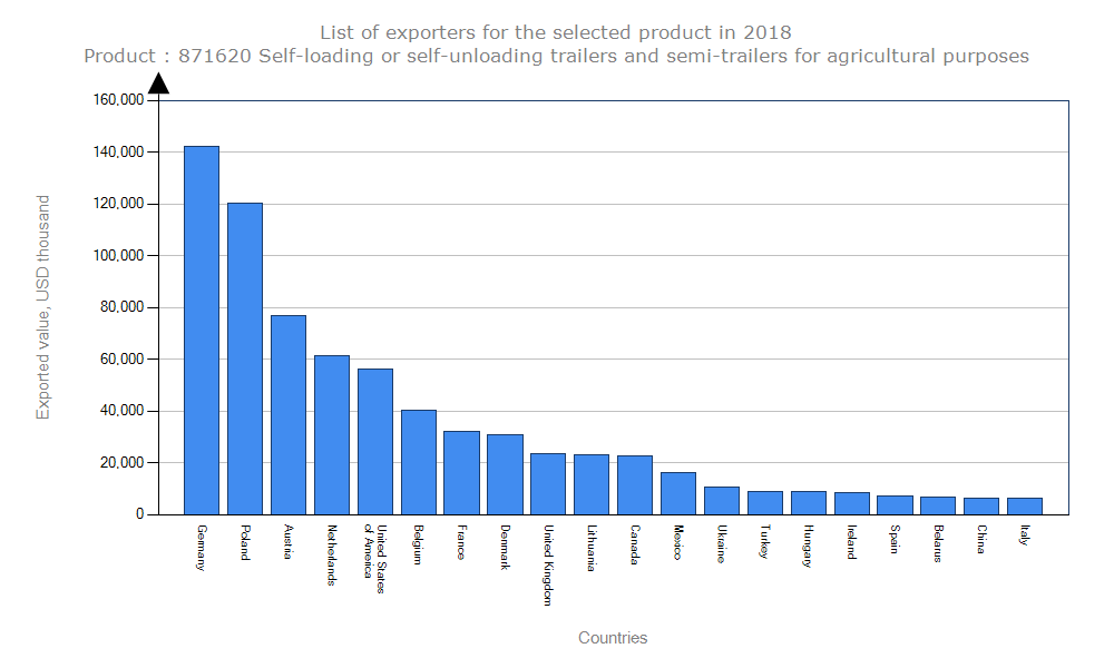 در ادامه این مطلب آمار و اطلاعات سودمندی درباره صادرات، واردات و ظرفیت های تجاری این محصول قرار دارد. تریلر کشاورزی (agricultural trailer) در گمرک جهانی با کد تعرفه (HS Code) به شماره ۸۷۱۶۲۰ شناخته می شود. این کد شامل تریلرها و نیمه تریلرهای بارگیری یا تخلیه خودکار برای مصارف کشاورزی می باشد.