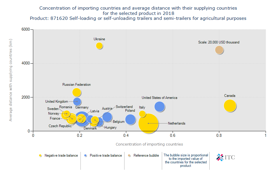 هرچه دایره ها به سمت بالاتر باشند گویای این است که فاصله ی کشور واردکننده تا محل تامین آن بیشتر است به عبارتی شعاع فاصله ای که میتوانیم در آن فعالیت کنیم بیشتر است. اگر خط عمودی این نمودار زیر ۲ الی ۳ هزار کیلومتر را نشان بدهد یعنی حمل و نقل و تامین کننده کالای مورد بررسی بسیار مهم و موثر می باشد پس راهکارهای حمل و نقلی را باید بررسی کرد. تامین برخی از کالاها محدود به کشوری خاصی است و به همین علت تامین آن از کشور های دورتر انجام می شود و به علت ارزش زیاد آن محصول حمل و نقل در آن مطرح نیست.