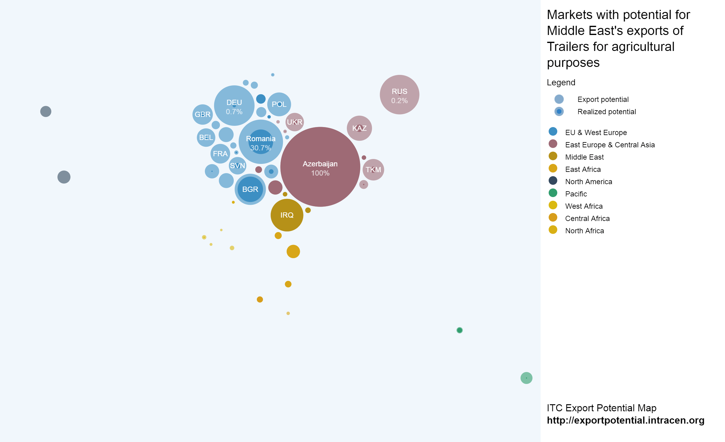 در این نقشه هر کشور با دایره و رنگ مربوط به منطقه آن نشان داده شده است. دایره داخلی و پررنگ تر هر کشور نشانگر میزان صادرات واقعی به آن کشور است و دایره کمرنگ تر دور آن نشان دهنده پتانسیل موجود بازار در آن کشور است. درصد نوشته شده در هر دایره بیانگر درصد پتانسیل صادرات به آن کشور است.