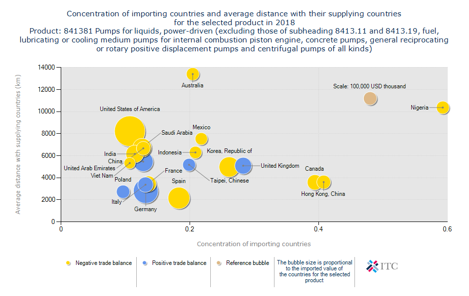 چنانچه زیر صفر و منفی باشد یعنی فرصت های تجاری این بازار در حال از بین رفتن است و آینده قابل پیش بینی ندارد و باید روی بازارهای کشورهای به سمت بالای نمودار تمرکز کرد. حجم و اندازه دایره های این نمودار نیز نشان دهنده ی رقم میزان تجارت کشورهاست.