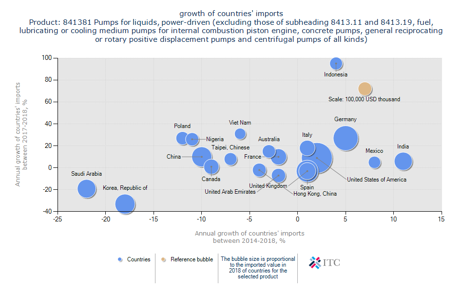 آمار صادرات پمپ آب کشاورزی هدف شناسایی رقبا در بازار جهانی است. رقم کل صادرات: ۴,۱۳۲,۲۹۸,۰۰۰ دلار میزان رشد بازار براساس ارزش واحد در ۵ سال اخیر: ۳- درصد میزان رشد یکساله براساس ارزش واحد : ۸ درصد و میانگین فاصله از کشور وارد کننده: ۴,۹۵۵ کیلومتر می باشد. آمار صادرات پمپ آب کشاورزی هدف شناخت متقاضیان و پتانسیل های کار در بازار جهانی است. رقم کل واردات: ۵,۳۸۰,۷۷۱,۰۰۰ دلار میزان رشد بازار براساس ارزش واحد در ۵ سال اخیر: ۴- درصد میزان رشد یکساله براساس ارزش واحد: ۰ درصد و میانگین فاصله از کشور صادر کننده :۵,۳۷۳ کیلومتر می باشد.
