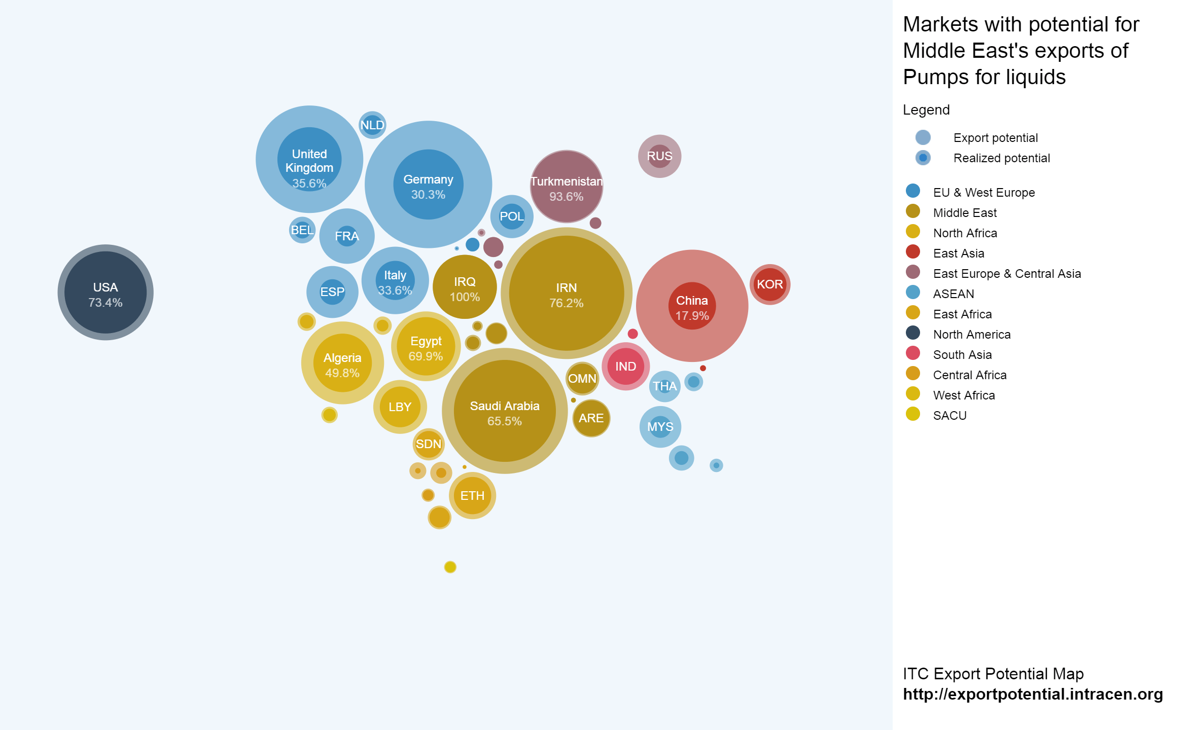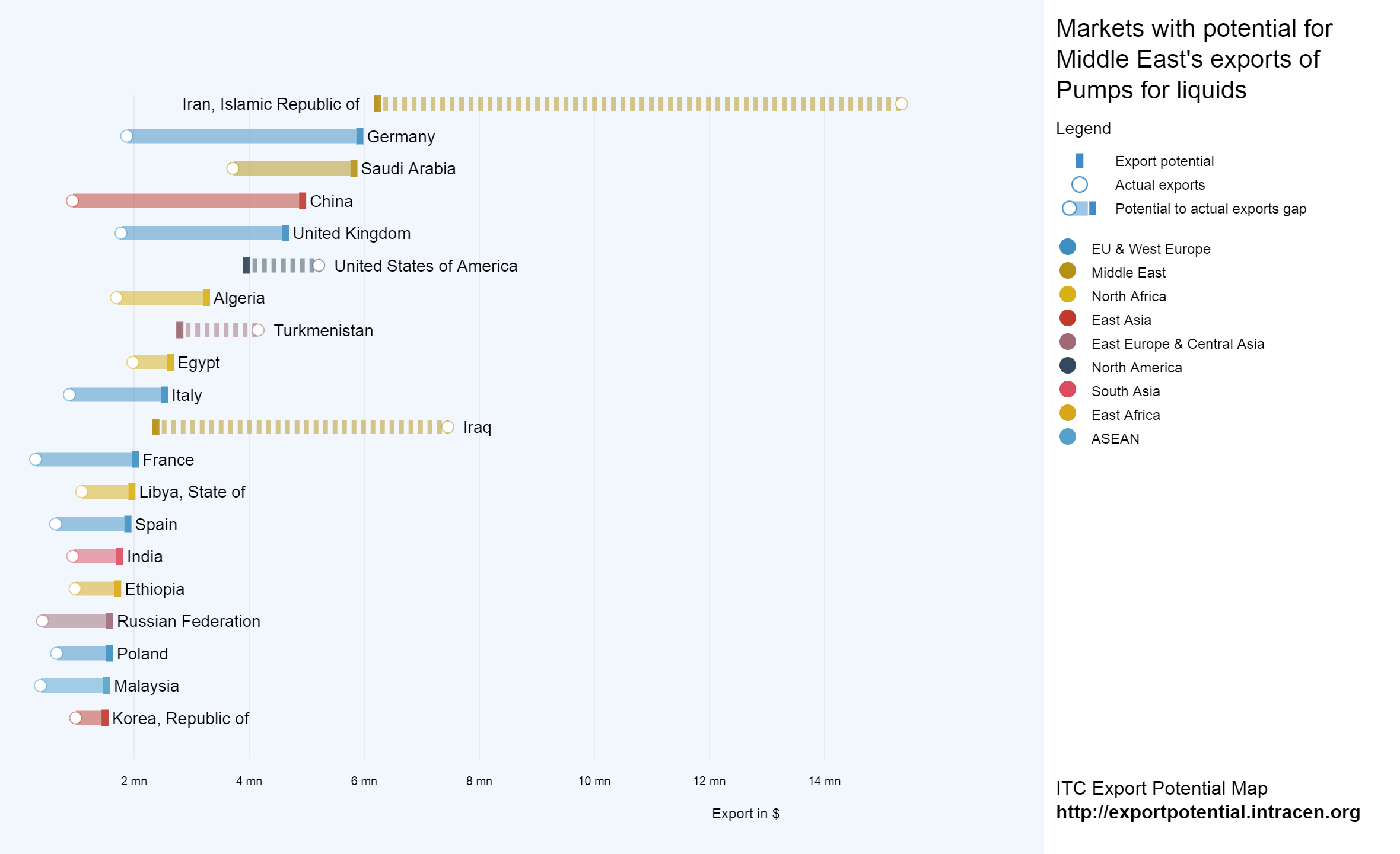بیشترین ظرفیت و پتانسیل صادراتی برای صادرات این محصول از خاورمیانه را کشورهای ایران، آلمان و عربستان سعودی دارا هستند. آلمان بیشترین تفاوت بین پتانسیل صادرات و صادرات واقعی را از نظر ارزش نشان می دهد، ظرفیت باقیمانده صادرات به ارزش ۴٫۰ میلیون دلار است.
