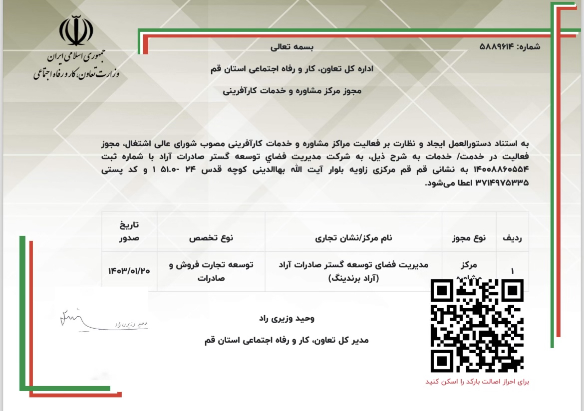 مجموعه بزرگ آراد برندینگ طی سالها با رعایت تمامی قوانین و مقررات مربوط به تجارت و بازرگانی در ایران به فعالیت خود ادامه داده است و همچنان در عرصه تجارت بینالمللی فعال و پایدار است.