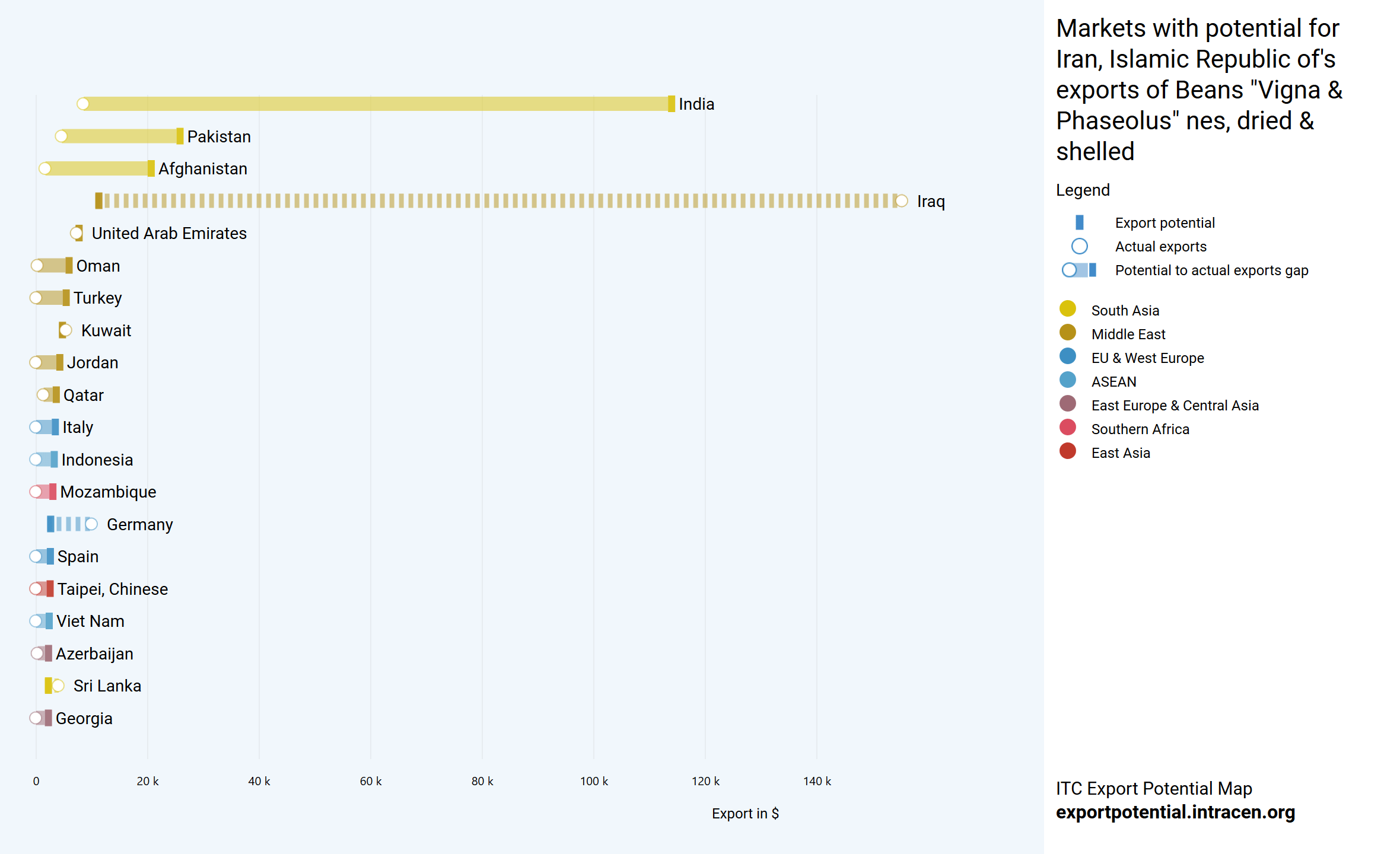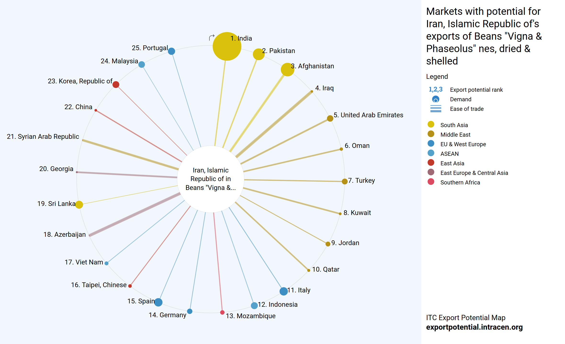 بیشترین ظرفیت و پتانسیل صادراتی برای صادرات لوبیا با توجه به ظرفیت بازار و روابط تجاری آسان را کشورها هند، پاکستان و افغانستان دارا هستند.