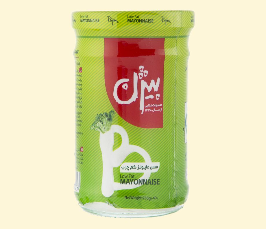 سس مایونز کم چرب بیژن یکی از برترین محصولات این تولید کننده خوش نام ایرانی است که درصد کلسترول و اسیدهای چرب آن کمتر از سس مایونز معمولی می باشد.