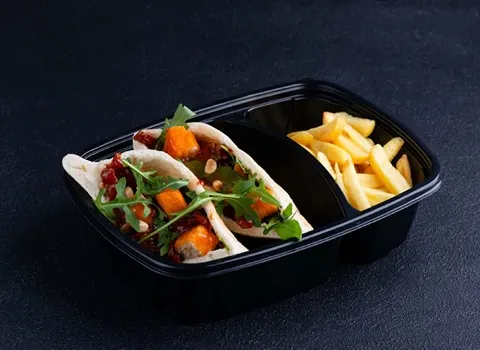 کاسه یکبار مصرف مشکی، از جنس پلی پروپیلن بوده و دارای یک درب شفاف است و در رستوران استفاده میشود.