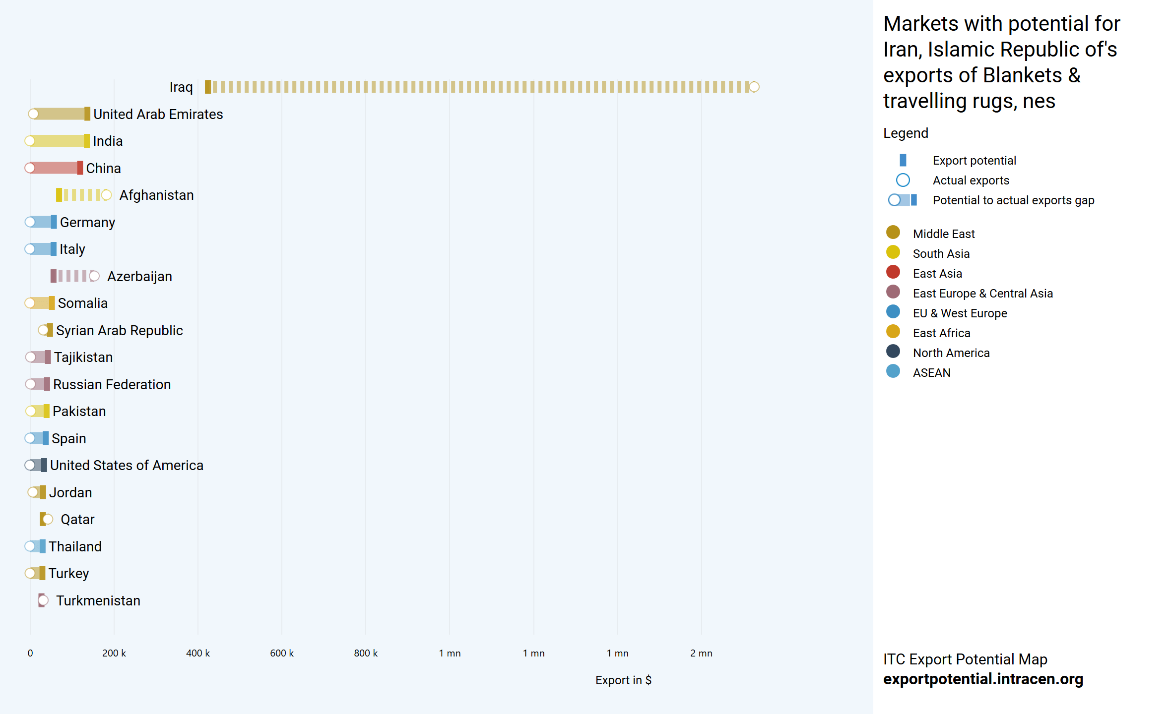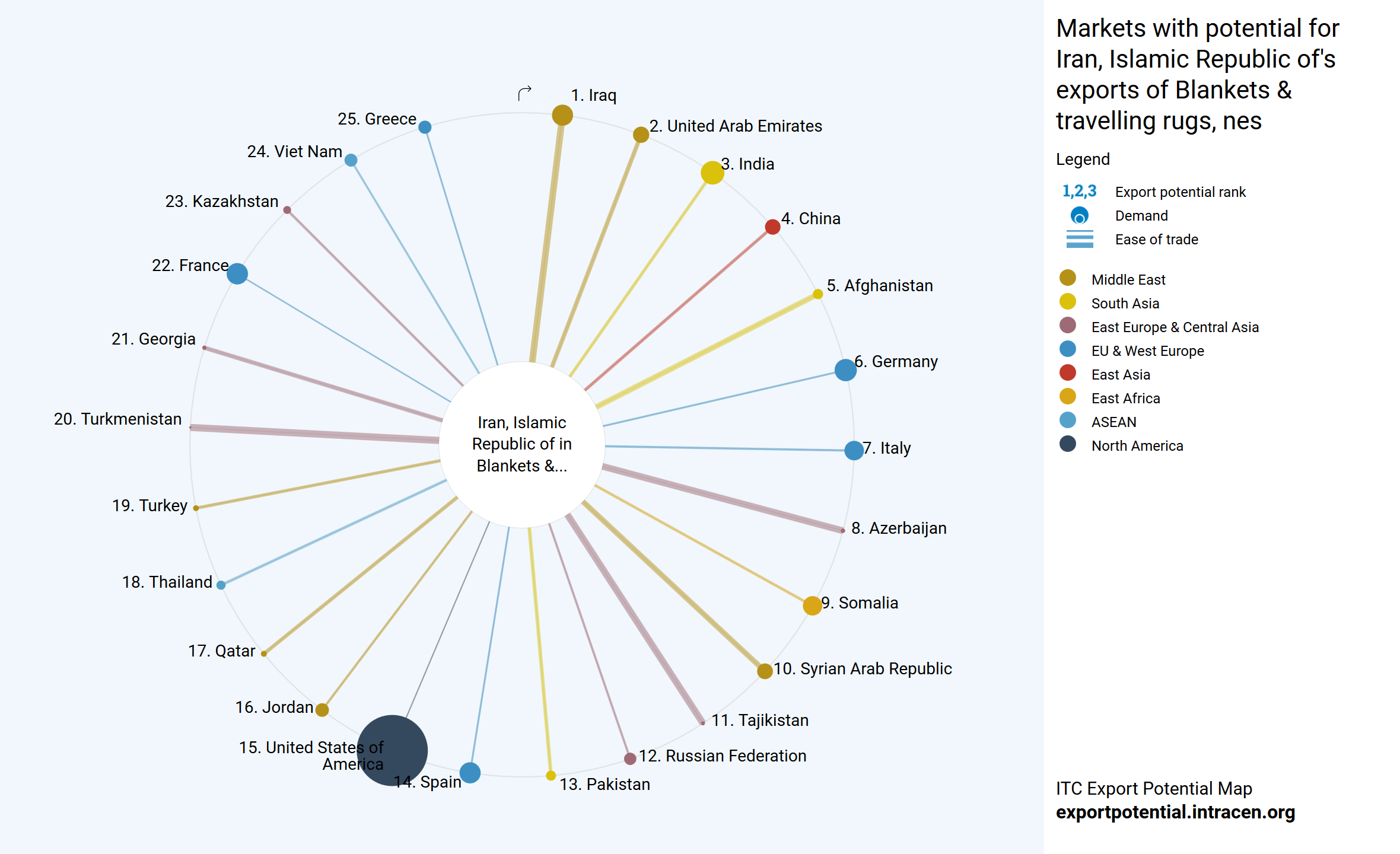 ایران نزدیکترین ارتباط صادراتی را با ترکمنستان دارد. بازار آمریکا بیشترین ظرفیت تقاضا را برای این محصول دارد. هند بیشترین تفاوت بین پتانسیل صادرات و صادرات واقعی را از نظر ارزش نشان می دهد، ظرفیت باقیمانده صادرات به ارزش ۱۱۹٫۶ هزار دلار است.