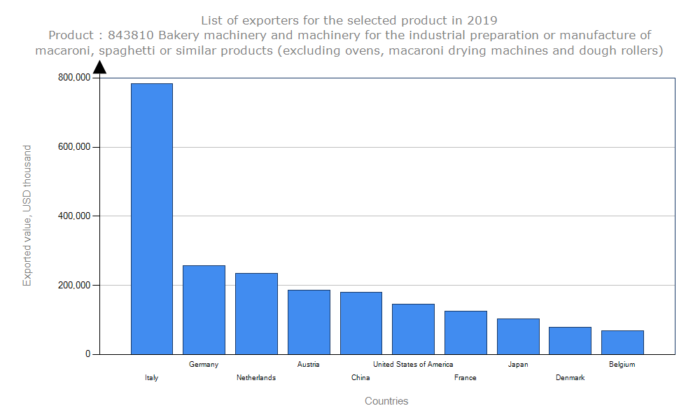 کشور ایتالیا بیشترین میزان صادرات دستگاه پخت نان در جهان را دارد و این بازار به صورت انحصاری در دست این کشور با ۷۸۲,۶۴۱ هزار دلار و ۳۰ درصد از سهم بازار جهانی می باشد. کشورهای آلمان، هلند، اتریش و چین در رتبه های بعدی صادرات این محصول قرار دارند. در مقابل آمریکا، روسیه و کانادا سه کشور اول در واردات دستگاه پخت نان هستند.