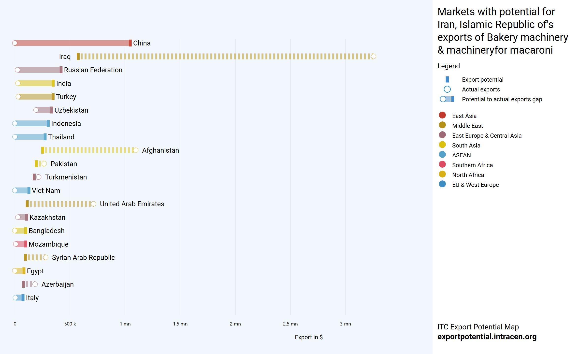 کشورهای عراق، افغانستان، پاکستان، ترکمنستان، امارات، سوریه و آذربایجان دارای بازار اشباع شده برای صادرات دستگاه پخت نان از ایران هستند و بیشتر از ظرفیتشان صادرات به آن ها انجام شده است. در عوض کشورهای چین، روسیه و هند دارای پتانسیل خوبی می باشند. البته کشورهای ترکیه، ازبکستان، اندونزی، تایلند، ویتنام و قزاقستان نیز به عنوان مقاصد صادراتی خوب می توانند مورد توجه قرار گیرند. بیشتر بخوانید: قیمت دستگاه پسته شکن دستی