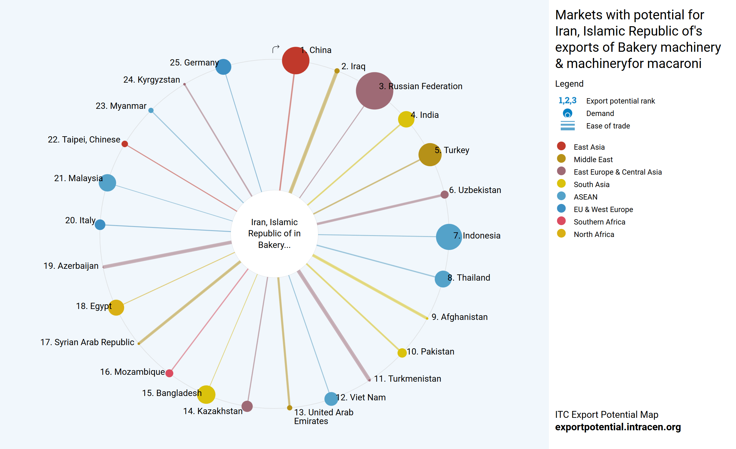 بهترین مقصدهای صادرات دستگاه پخت نان از ایران با توجه به میزان پتانسیل صادراتی و آسان بودن روابط تجاری دو کشور را کشور چین، روسیه و هند دارا هستند. ایران نزدیکترین ارتباط صادراتی را با ترکمنستان دارد. بازار روسیه بیشترین ظرفیت تقاضا را برای انواع دستگاه پخت نان دارد. چین بیشترین تفاوت بین پتانسیل صادرات و صادرات واقعی را از نظر ارزش نشان می دهد، ظرفیت باقیمانده صادرات به ارزش ۱٫۰ میلیون دلار است.