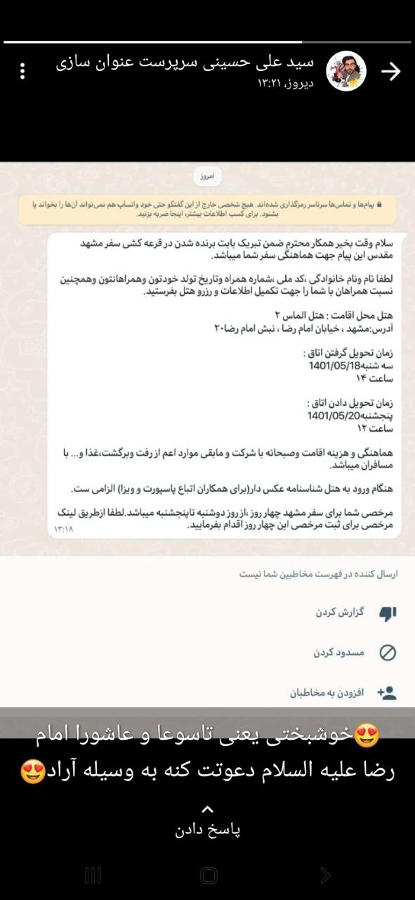 سید علی حسینی سرپرست واحد عنوان سازی، تصویری فیش سفر مشهد، هدیه ی مجموعه آراد را در وضعیت خود به اشتراک گذاشت.