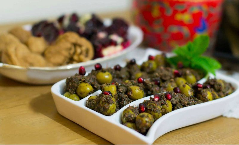 اول زیتونها را شسته و درون ظرف می ریزیم، سپس گردوها را خرد می کنیم، گردوی خرد شده نباید خیلی درشت باشد و زیر دندان بیاید و باید له شده و خمیری شل شود.