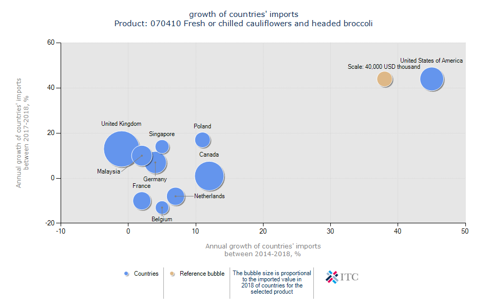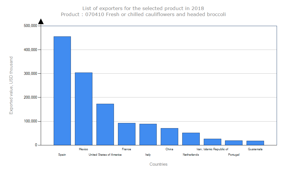 با توجه به چارت بالا اسپانیا، مکزیک و آمریکا بیشترین میزان صادرات گل کلم را در بازار جهانی دارند. کشورهای فرانسه و ایتالیا رتبه چهار و پنج را در بازار جهانی دارا هستند.