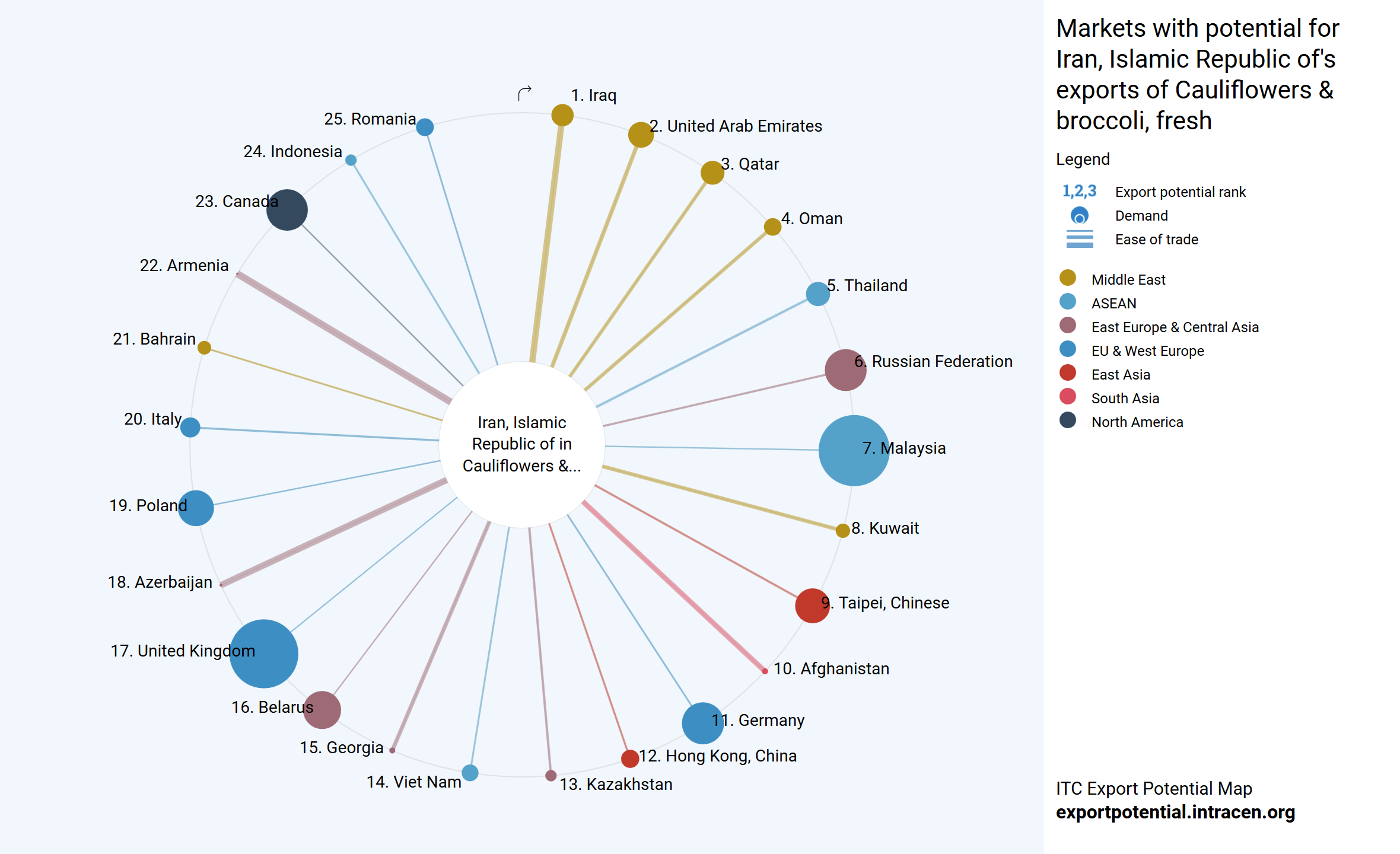 ایران نزدیکترین ارتباط صادراتی را با ارمنستان دارد و بازار مالزی بیشترین ظرفیت تقاضا را برای گل کلم شده دارد.