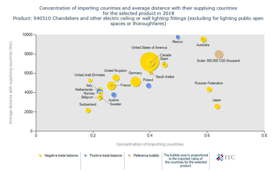 هرچه دایره ها به سمت بالاتر باشند گویای این است که فاصله ی کشور واردکننده تا محل تامین آن بیشتر است به عبارتی شعاع فاصله ای که میتوانیم در آن فعالیت کنیم بیشتر است. اگر خط عمودی این نمودار زیر ۲ الی ۳ هزار کیلومتر را نشان بدهد یعنی حمل و نقل و تامین کننده کالای مورد نظر بسیار مهم و موثر می باشد پس راهکارهای حمل و نقلی را باید بررسی کرد. تامین برخی از کالاها محدود به کشورهای خاصی است لذا تامین آن از کشورهای دورتر انجام میشود و به علت ارزش زیاد آن محصول حمل و نقل در آن مطرح نیست.