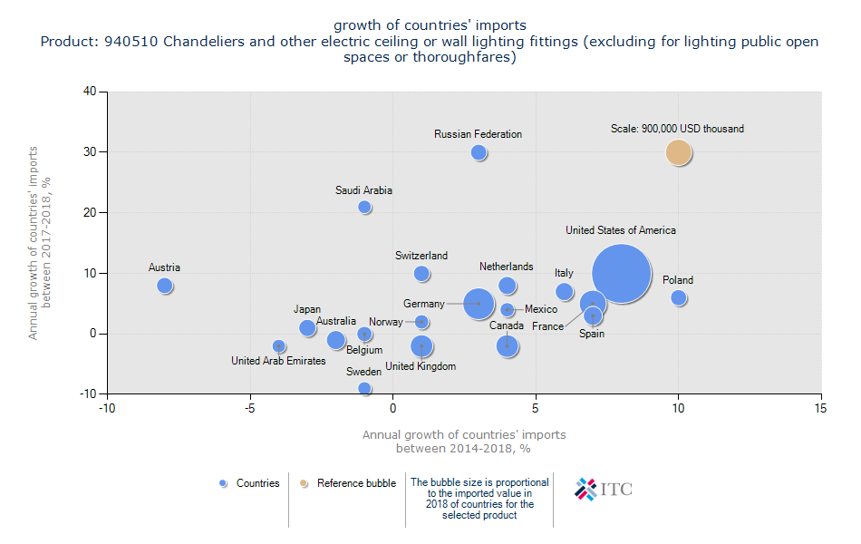 نمودار عمودی نشان دهنده مقدار رشد یکساله بازار محصول انتخابی و نمودار افقی نشان دهنده ی رشد بازار در ۵ سال گذشته می باشد.هرچه نمودار به صفر نزدیکتر باشد به این معنا است که میزان رشد بازار این محصول کاهش پیدا کرده، در حال کوچکتر شدن است و دارای ظرفیت های رشد زیادی نیست. چنانچه زیر صفر و منفی باشد یعنی فرصت های تجاری این بازار در حال از بین رفتن است و آینده قابل پیش بینی ندارد و تمرکز اصلی را باید روی بازار کشورهای بالای نمودار گذاشت. حجم و اندازه دایره های این نمودار نیز نشان دهنده ی رقم میزان تجارت کشورهاست.