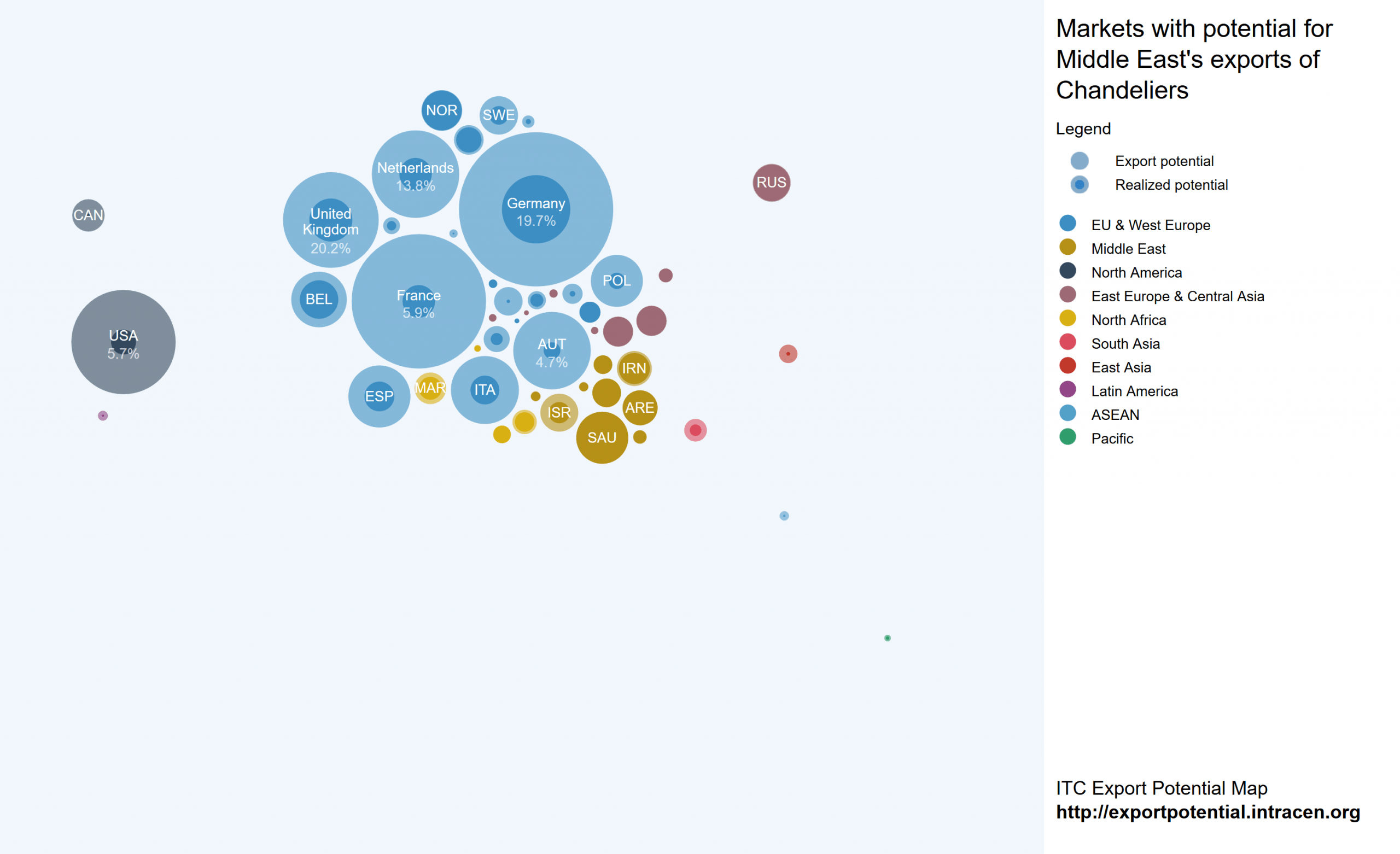در این نقشه که هر کشور با دایره و رنگ مربوط به منطقه آن نشان داده شده، دایره داخلی و پررنگ تر هر کشور نشانگر میزان صادرات واقعی به آن کشور است و دایره کمرنگ تر دور آن نشان دهنده پتانسیل موجود بازار در آن کشور است. درصد نوشته شده در هر دایره بیانگر درصد پتانسیل صادرات به آن کشور از خاورمیانه است.