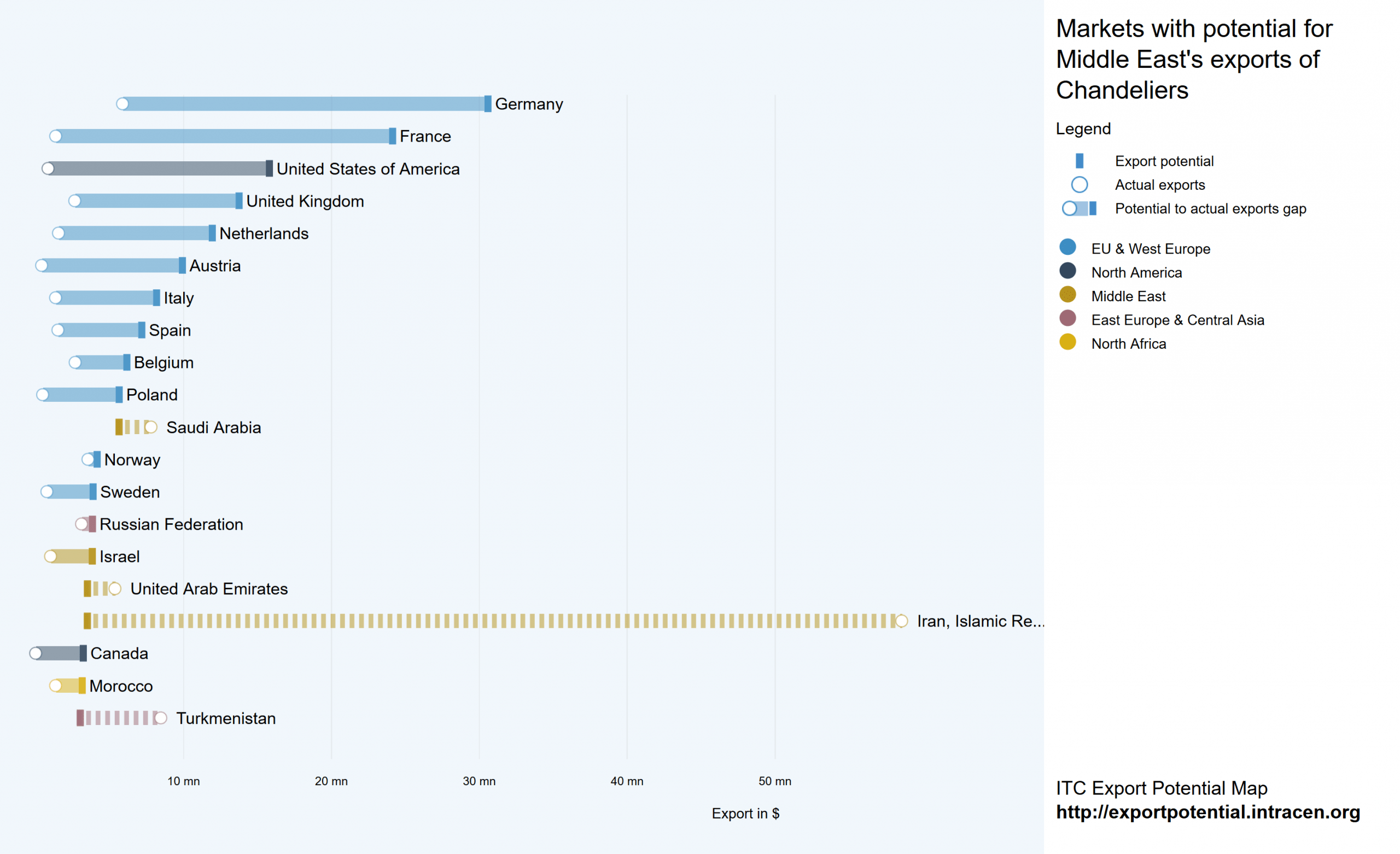 بیشترین ظرفیت و پتانسیل صادراتی برای صادرات این محصول از جمهوری اسلامی ایران را کشورهای آلمان،فرانسه و آمریکا دارا هستند. آلمان بیشترین تفاوت بین پتانسیل صادرات و صادرات واقعی را از نظر ارزش نشان می دهد ، ظرفیت باقیمانده صادرات به ارزش ۲۴٫۱ میلیون دلار است.