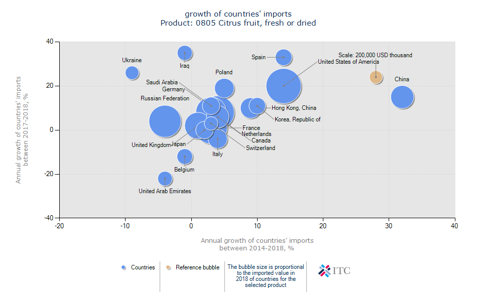 نمودار عمودی نشان دهنده مقدار رشد یکساله بازار محصول انتخابی و نمودار افقی نشان دهنده ی رشد بازار در پنج سال گذشته می باشد. هرچه نمودار به صفر نزدیکتر باشد به این معنا است که میزان رشد بازار این محصول کاهش پیدا کرده، در حال کوچکتر شدن است و دارای ظرفیت های رشد زیادی نیست. چنانچه زیر صفر و منفی باشد یعنی فرصت های تجاری این بازار در حال از بین رفتن است و آینده قابل پیش بینی ندارد و تمرکز اصلی را باید روی بازار کشورهای بالای نمودار گذاشت. حجم و اندازه دایره های این نمودار نیز نشان دهنده ی رقم میزان تجارت کشورهاست.