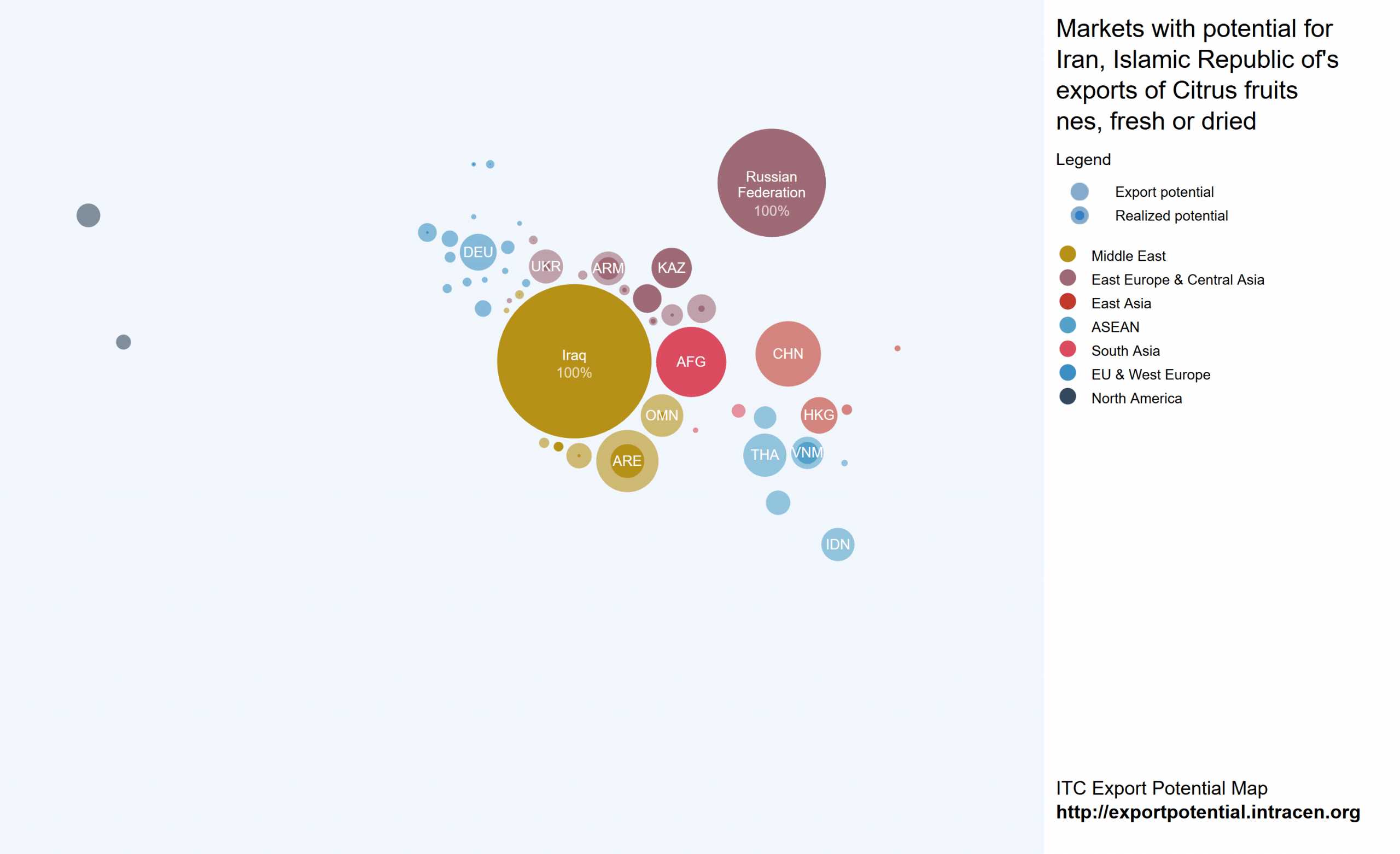 در این نقشه هر کشور با دایره و رنگ مربوط به منطقه آن نشان داده شده است. دایره داخلی و پررنگ تر هر کشور نشانگر میزان صادرات واقعی به آن کشور است و دایره کمرنگ تر دور آن نشان دهنده پتانسیل موجود بازار در آن کشور است. درصد نوشته شده در هر دایره بیانگر درصد پتانسیل صادرات به آن کشور است.