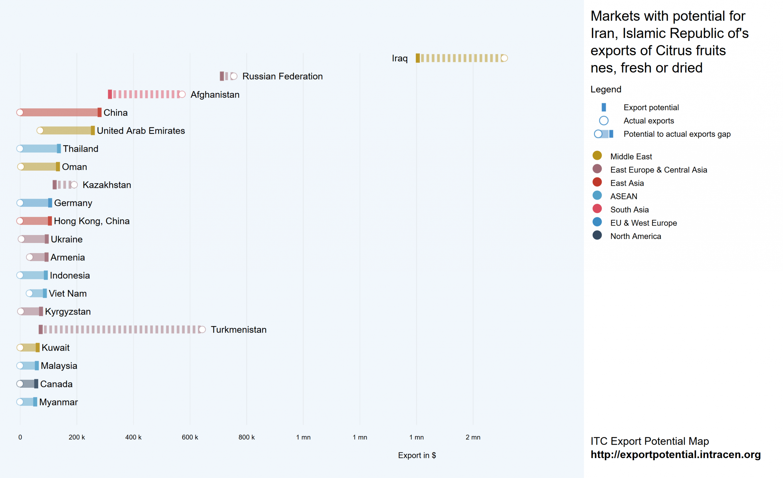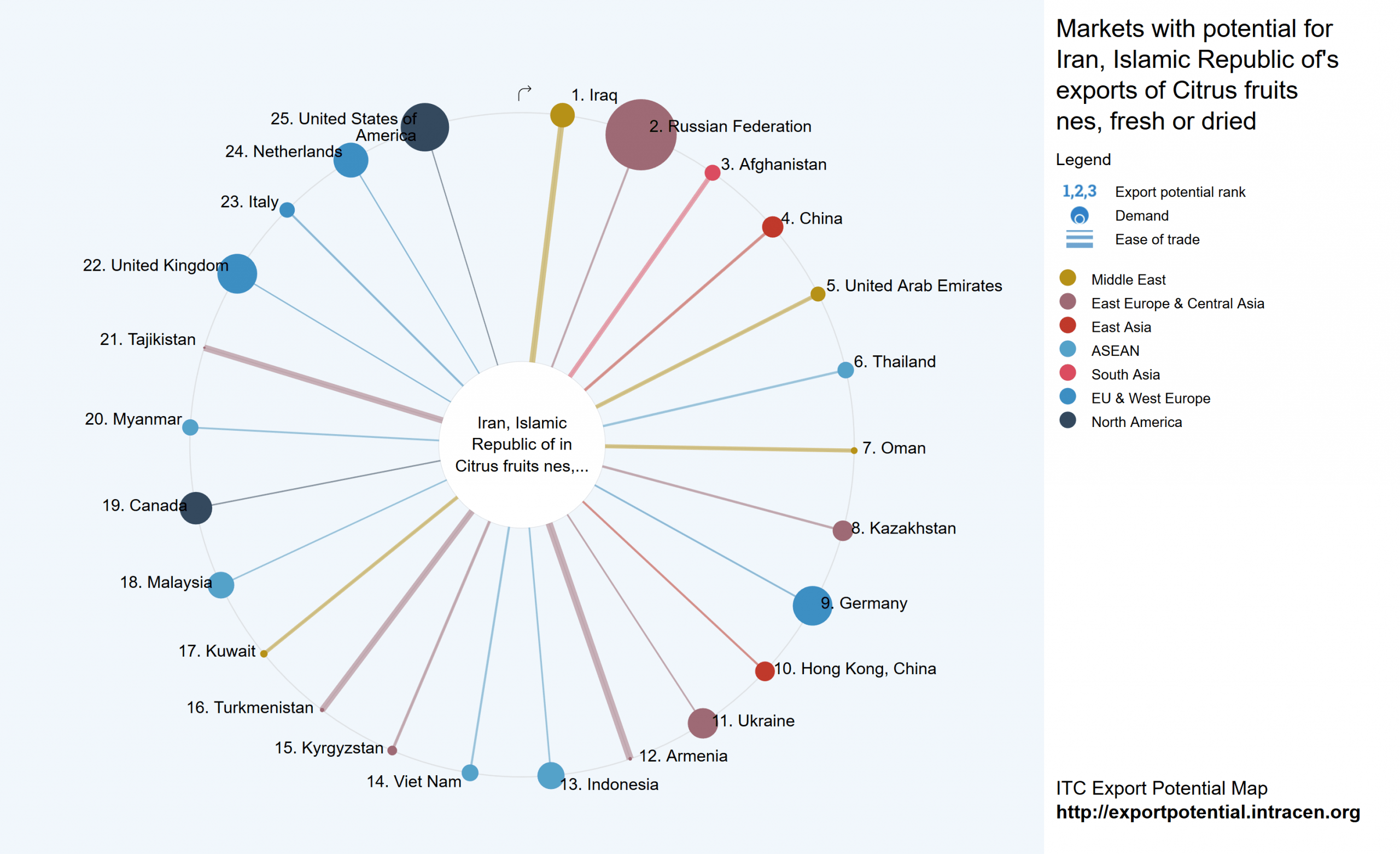 در این نمودار میزان توان و ظرفیت صادرات به کشورهای دیگر را به ترتیب عددی، که نشان دهنده ی رتبه پتانسیل صادراتی و به ترتیب اندازه دایره، که نشان دهنده ی میزان تقاضای کشورها و به ترتیب پهنای خط، که نشان دهنده ی سهولت معامله با آن هاست، میتوان مشاهده کرد. اسم هر کشور کنار دایره نوشته شده و رنگ دایره هر کشور طبق منطقه آن دسته بندی شده است. برای مثال دایره های قرمز کشورهای منطقه شرق آسیا را نشان میدهد.