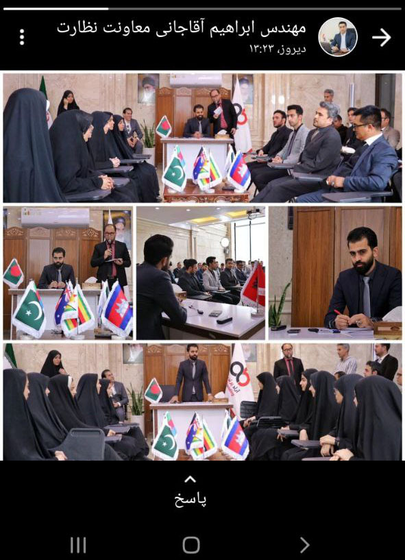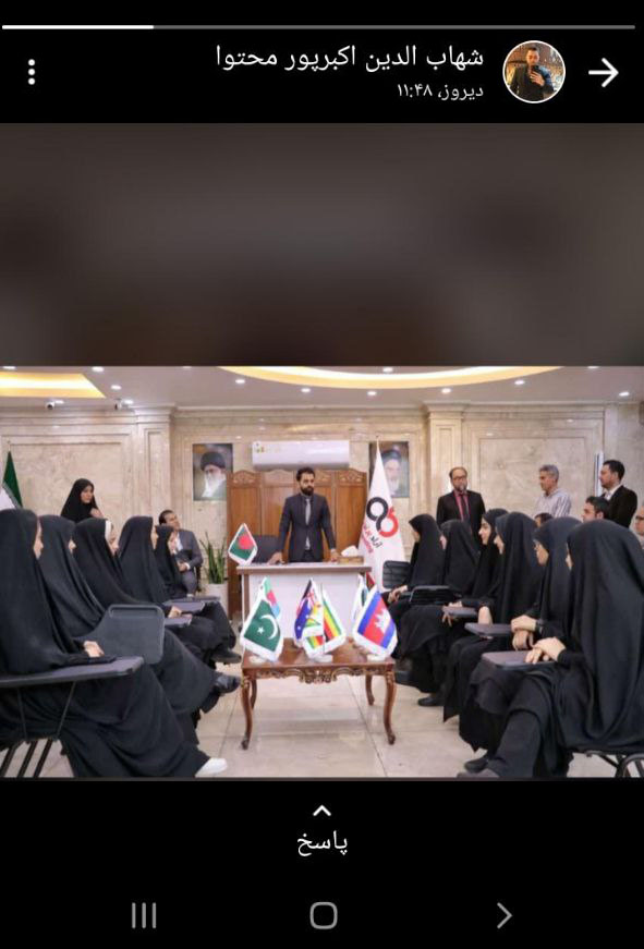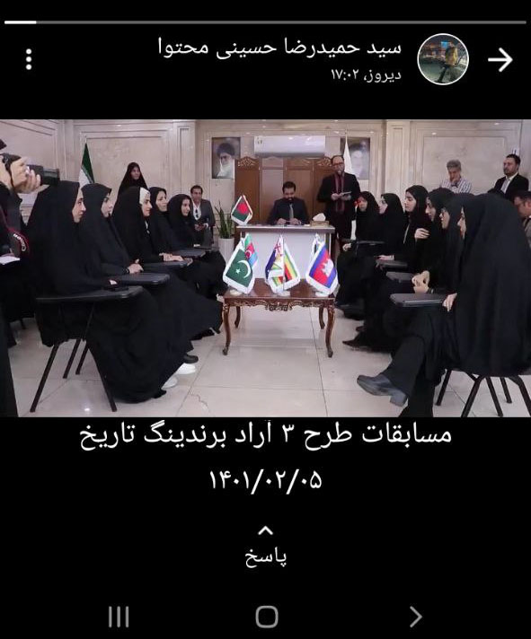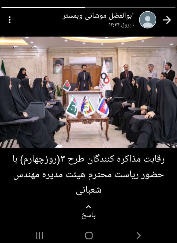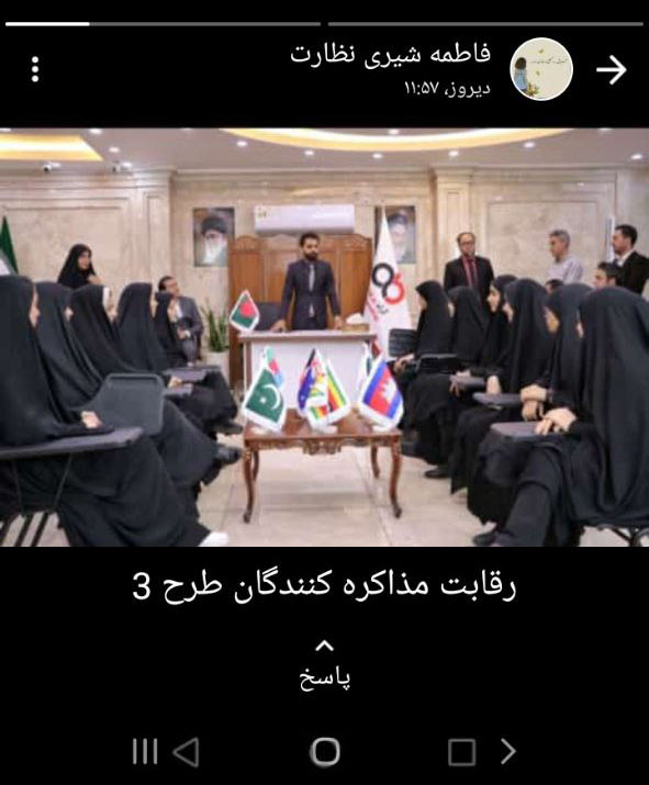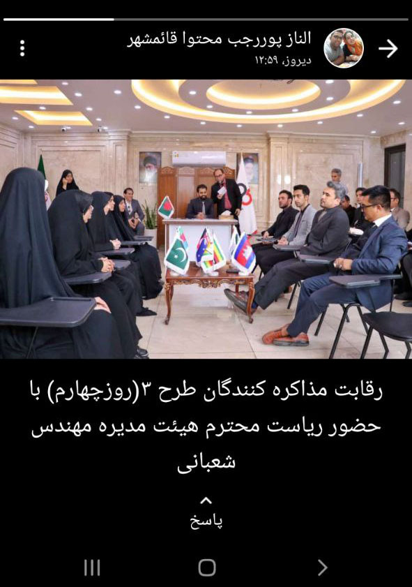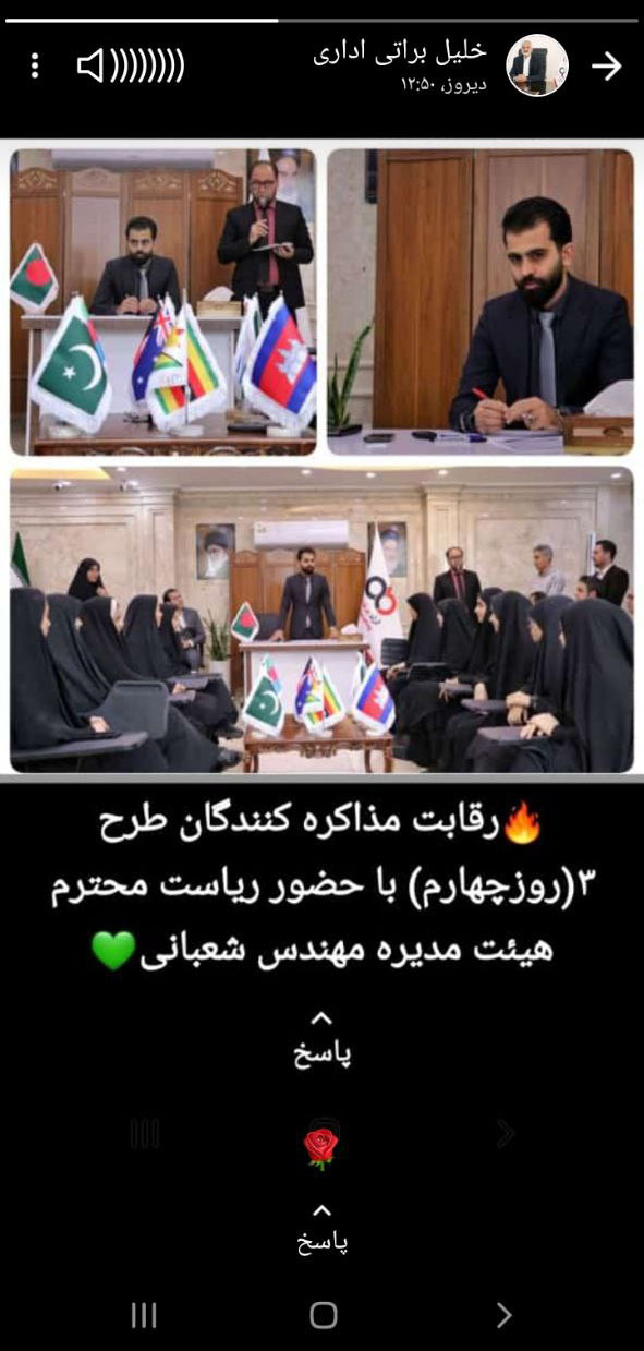 زهرا سیامکی از همکاران مشغول در بخش گرافیک، کلیپی از رئیس هیئت مدیره در مسابقات مذاکره کنندگان بین الملل را در استاتوس خود منتشر کرد.